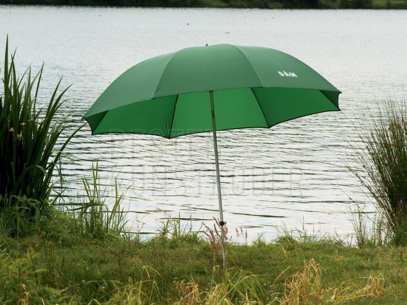 Funktioneller und qualitativ hochwertiger Anglerschirm. Oberteil abknickbar, ausziehbarer Erdspeer. Bogenspannweite: 2,20 m.