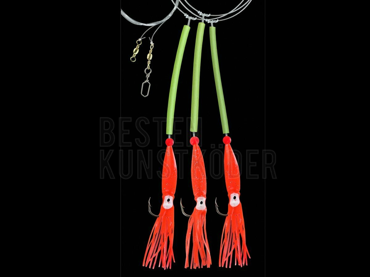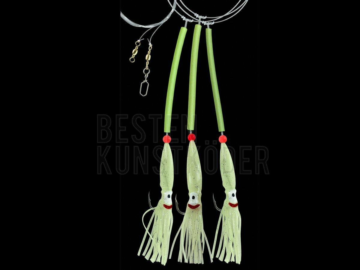 Das Dega Sea Rig mit 3 UV Octopus Side Arms ist ein äußerst effektives Meeresvorfach für das Angeln auf große Räuber wie Dorsch, Heilbutt und Leng. Drei bewegliche, UV-aktive Octopus-Arme sorgen für maximale Lockwirkung und provozieren Bisse auch in tiefem Wasser.