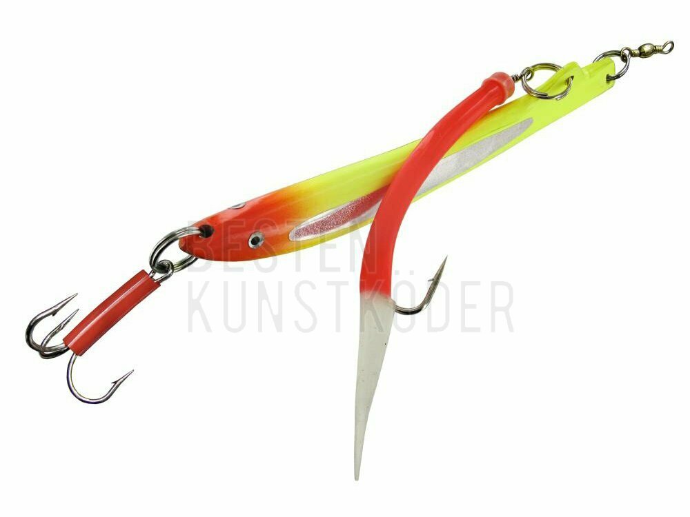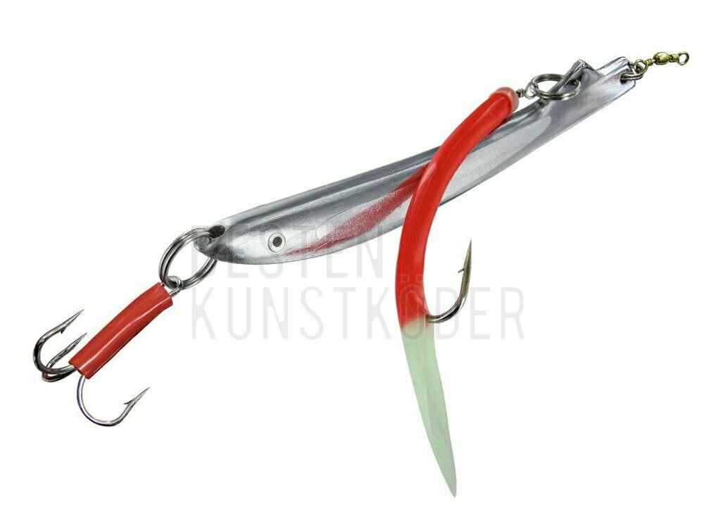 Bananenpilker mit Gummi-Makk Durch seine gängige und erfolgreiche Bananen- Pilker Form ein absoluter Erfolgsköder. Zusätzlich zur leuchtende und stark reflektierenden Farbeauswahl (Silber, Luminous/Orange) ist noch ein zusätzlicher Gummi-Makk montiert. Mit superstarken Springringen und Haken.