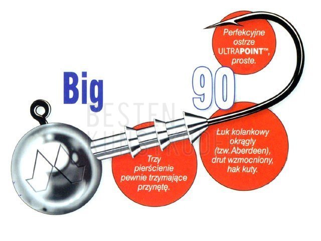 Big Game Jig-Köpfe wurden auf Basis eines speziell dafür entwickelten, extrem starken 3x Strong Haken aus Heavy Duty Draht gebaut, der mit der Ultra Point Technologie geschärft wird. Jeder Haken für die zusätzliche Erhöhung der Widerstandsfähigkeit wurde seitens abgeflacht. Das Scheiben-System wurde speziell für dieser Serie verstärkt.