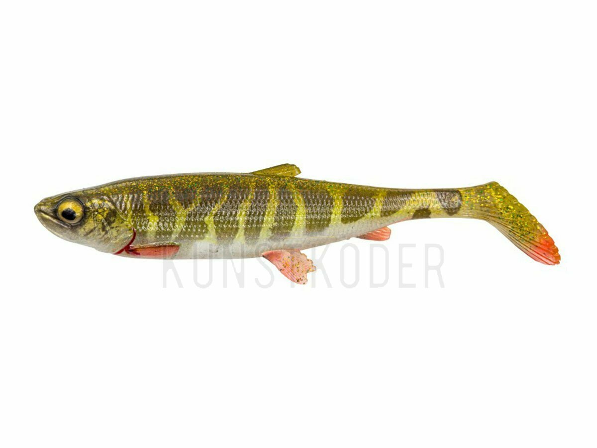 Die naturgetreuen Flossen ergänzen den kräftig schlagenden Schaufelschwanz, der zudem mit einer integrierten Glasrassel ausgestattet ist. So entstehen starke Vibrationen und akustische Reize, die auch vorsichtige Räuber zuverlässig zum Angriff verleiten. Das superweiche PVC-Material in Kombination mit lebensechten Farben und einem lockenden Aroma macht den Köder besonders attraktiv.