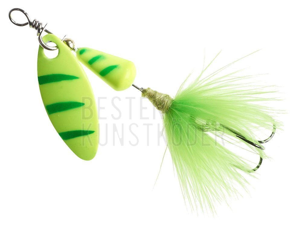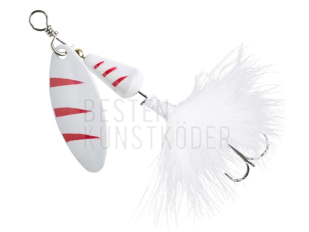 Topp Spinner für Barsch, Forelle und Döbel. Mit nadelscharfen Mustad Haken. Dank Sprengring kann der Drilling einfach z.B. gegen einen Einzelhaken getauscht werden.