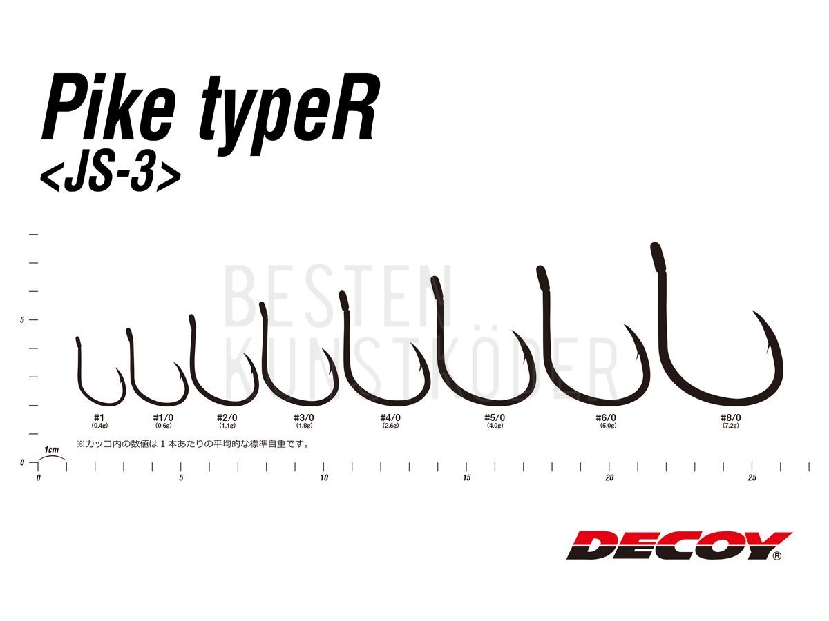 Die langlebigen Decoy JS-3 Pike Type-R Haken können dank des erhöhten Drahtdurchmessers für die größten Kunstköder verwendet werden. Geeignet zum Aufstellen von großen Hechtködern und Meeresjigs! Große Auswahl an Größen.