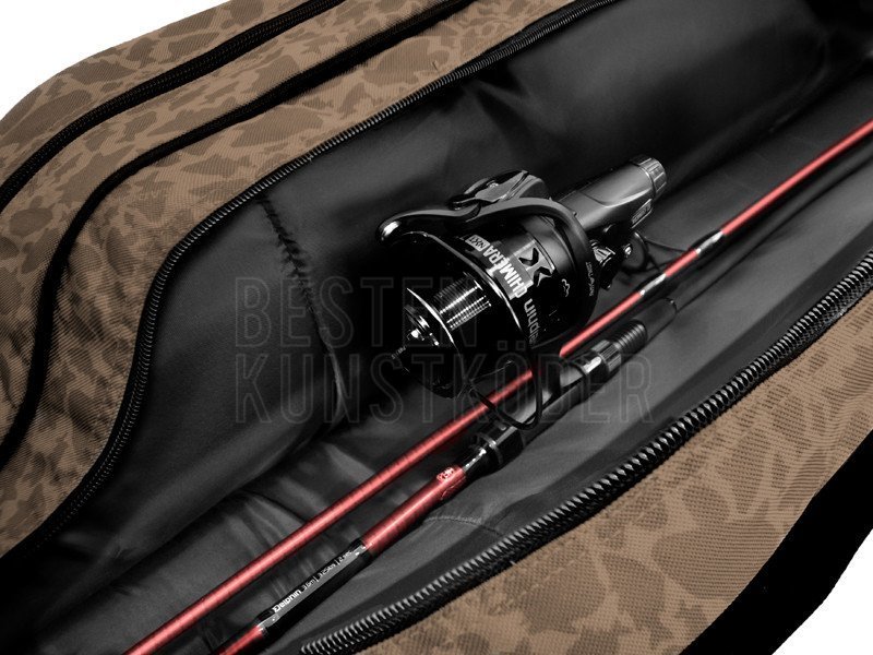 Die Wände des Futterals sind mit einer 6mm dicken Auskleidung gründlich gepolstert und der Innenraum bietet genügend Platz für die komfortable Aufbewahrung aller Karpfenruten mit Rollen. Selbst Ruten mit einem 50mm Rutenringe passen problemlos und mit genügend Reserve in das Rutenfutteral. Jede Kammer verfügt über einen separaten, herausnehmbaren Einlass, der dafür sorgt, dass die Ruten jederzeit voneinander getrennt sind und mittels praktischer Lager im unteren Teil sowie durch Klettbänder perfekt fixiert werden. Dank des erwähnten Austauschs ist gewährleistet, dass die Ausrüstung im Inneren während des Transports und der Handhabung des Futterals maximal geschützt ist.