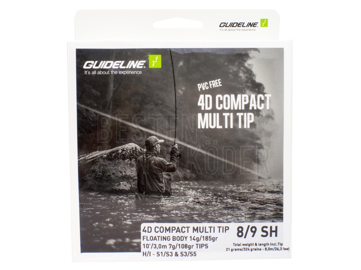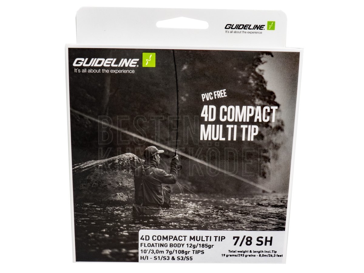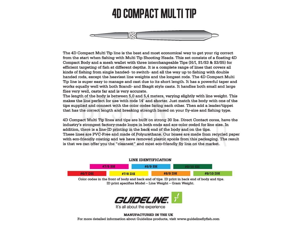Die Guideline 4D Compact Multi Tip ist ein fischfertiges Set mit einem schwimmenden 4D Compact Body und einem Netzetui mit drei austauschbaren Spitzen in unterschiedlichen Dichten. Die 4D Compact Multi Tip Schnur ist die beste und kostengünstigste Lösung, um Ihre Ausrüstung beim Angeln mit Multi Tip Shooting Heads, die an einer Shooting Line befestigt sind, von Anfang an optimal vorzubereiten. Dieses Set besteht aus einem schwimmenden 4D Compact Body und einem Netzetui mit drei austauschbaren Spitzen mit unterschiedlichen Sinkgeschwindigkeiten (H/I, S1/S3 und S3/S5) für effizientes Anvisieren von Fischen in unterschiedlichen Tiefen. Das komplette Schnursortiment deckt alle Angelarten ab, von der Einhand- über die Switch- bis hin zur Zweihandrutenangelei, mit Ausnahme der schwersten Schnurgewichte und der längsten Ruten. Die 4D Compact Schnur ist dank ihrer kurzen Länge besonders handlich und leicht zu werfen. Sie hat eine kraftvolle Verjüngung und eignet sich gleichermaßen für Scandi- und Skagit-Würfe.
