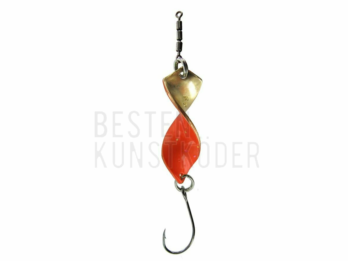 Der Propeller-Spoon eignet sich durch sein drehendes Laufverhalten ideal für das Angeln auf Forelle. Die starke Reizentwicklung durch die sich drehende Form sowie die auffallende Lackierung machen diesen Forellenköder zu einem richtige Erfolgsköder am Forellensee oder Bach.