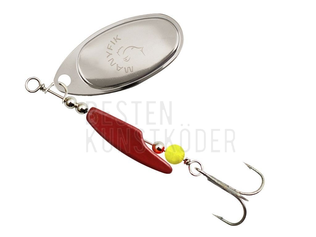 Spinner Manyfik Mobby F wurde so entworfen um schließlich das alte Problem in den traditionellen Konstruktionen zu lösen, nämlich – KEINE PROBLEME MIT DEM DREHEN DER LEINE !!! Der Lose drehender Körper des MOBBY F wurde so entwickelt um den Spinner zu balancieren und die Tiefe wie ein Geschoss zu schneiden. Die Anwendung des Blinkers Typ AGLIA stellt bestimmt die traditionellen Angler, die Barsche und Hechte jagen. Ein weiterer Lockmittel ist die runde Perle, die Laich imitiert was ein sehr starker Anreiz ist sowohl für Barsch wie auch für Hecht. Erhältlich mit einer silberner Fertigung (Nickel) und goldener (poliert und Messing lackiert).
