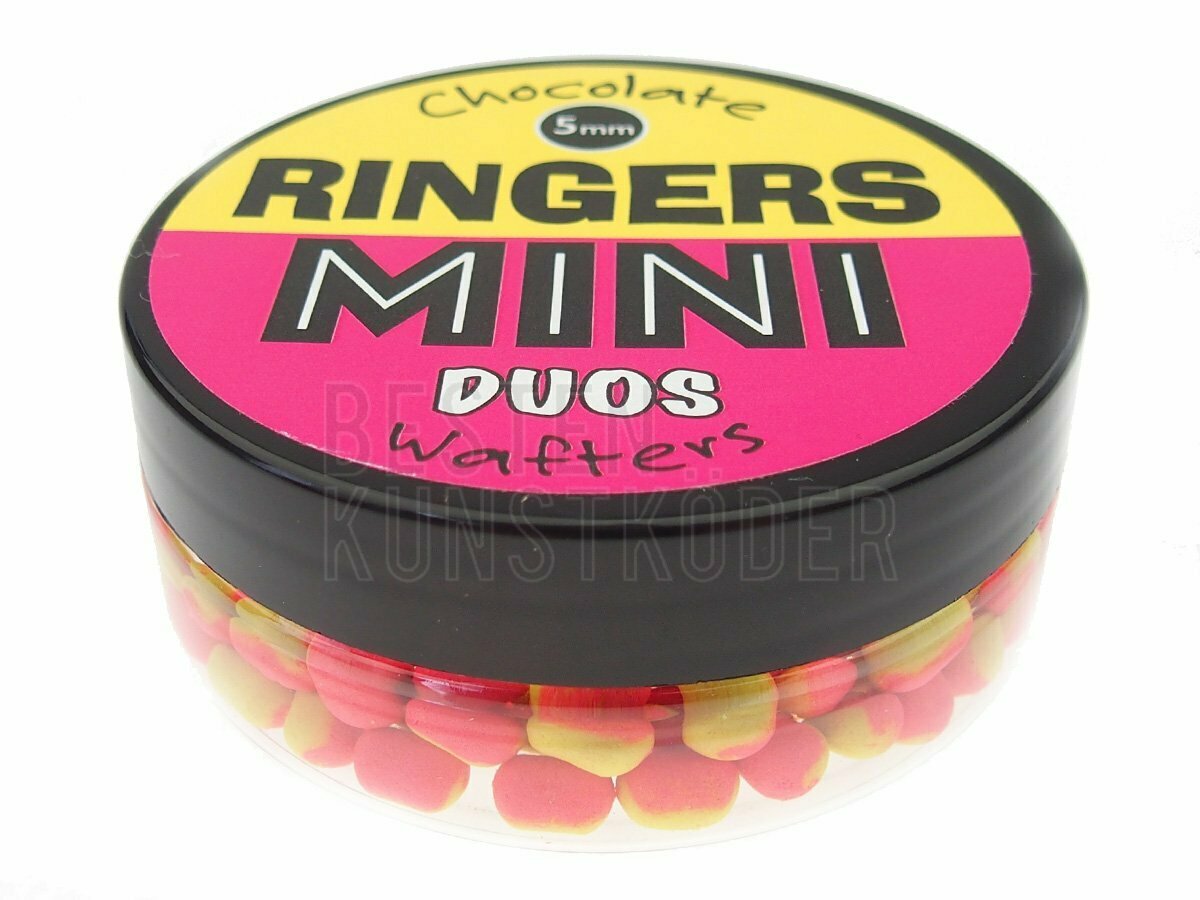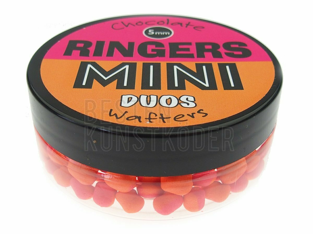 Ringers Mini Wafters Duos, Größe 8 x 5 mm, sind neutral schwimmfähige Hanteln. Diese Wafters haben das intensive Schokoladenaroma, für das Ringers Baits bekannt sind. Sie garantieren Erfolg in den meisten kommerziellen Fischereien.