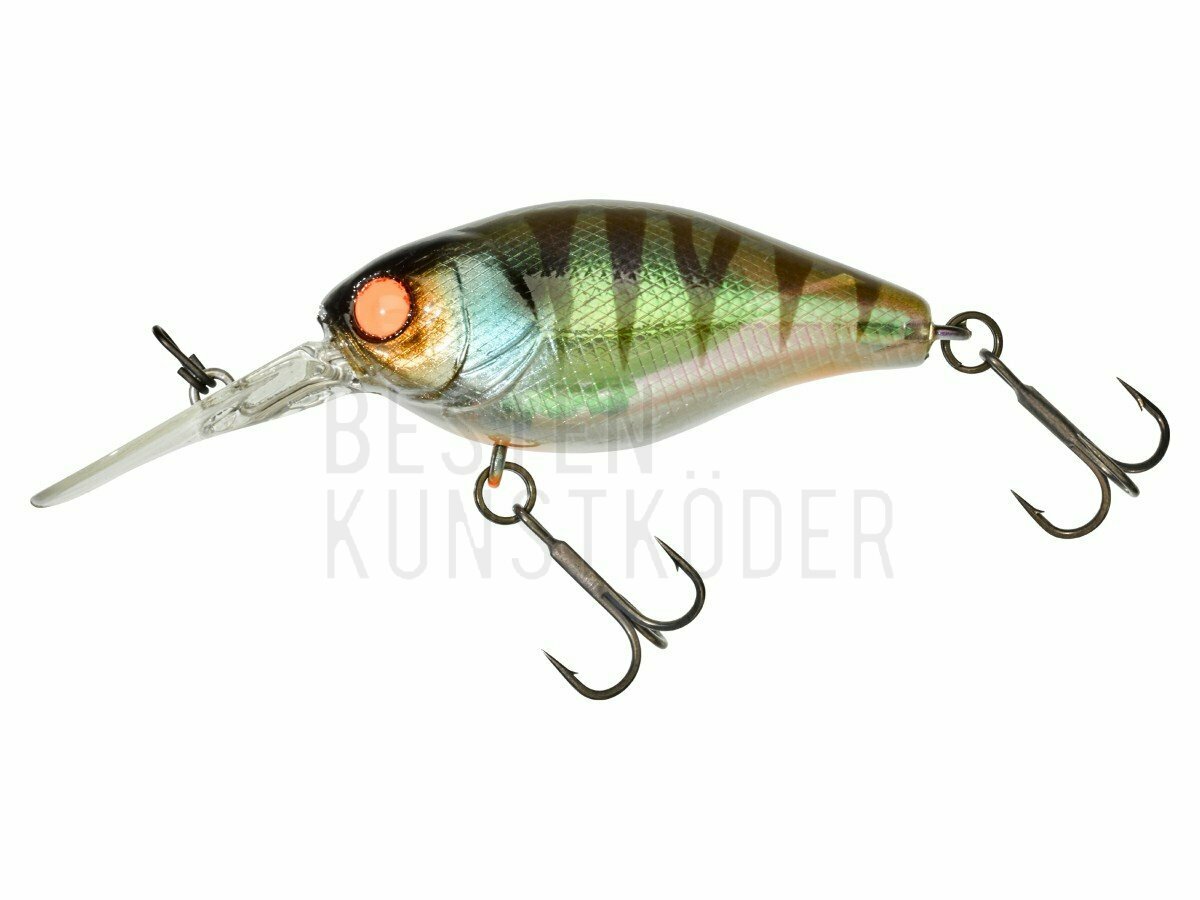 Der diving Cherry erreicht ziemlich exakt 2m Tiefe und ist nicht nur von der Größe her für viele Räuber interessant. Er vereint 'Wobbling' mit 'Rolling' und wenn das Wasser flacher als 2m ist, klopft er mit seiner breiten Schaufel an Steinen und versunkenen Bäumen an ('bottom bouncing'), dabei bewegt er sich rollend vorwärts, die Drillinge drehen sich bei Kontakt nach oben und man bleibt nur selten hängen. Ideal zum aufspüren von Fischen an Hindernissen.